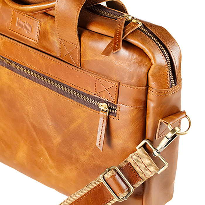Elevate your everyday carry with the Motivator briefcase designed for modern work and timeless style. Handcrafted from Water Buffalo leather, this executive briefcase blends rugged durability with refined craftsmanship—perfect for professionals who want function without sacrificing character. Sized to fit a large laptop or similar devices, the structured interior keeps your laptop, documents, and daily essentials organized and secure. A front zip pocket offers quick access on the go, while the adjustable canvas strap allows you to wear it comfortably over the shoulder or crossbody during busy days. The vintage-inspired finish gives each briefcase its own unique look, developing even more character over time. Whether you’re heading to the office, traveling for work, or settling into your favorite coffee shop, this briefcase transitions effortlessly between professional and casual settings. A thoughtful gift for graduations, Father’s Day, or career milestones, this executive briefcase is more than a laptop bag—it’s a statement of craftsmanship, purpose, and everyday sophistication.